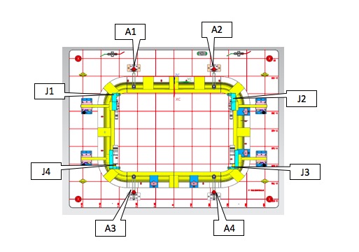 2、汽車檢具定位:打開所有壓鉗,將產品定位對準檢具A1-A4定位面,插入B.C定位銷,依次壓緊夾鉗A1-A4,使零件無晃動現象,完成零件定位。
