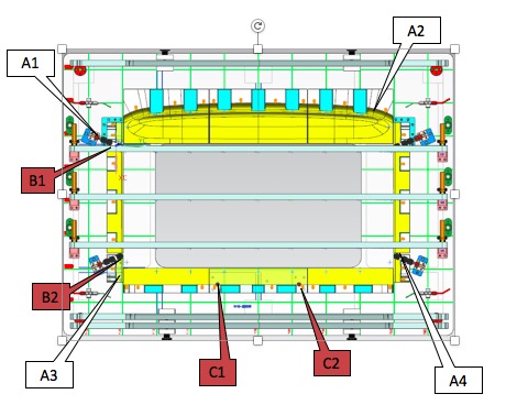 2、定位:先將所有壓鉗打開,再將遮陽板組合產(chǎn)品平穩(wěn)放置于檢具上A1-A4定位面上,零貼B1/B2 C1/C2定位柱,然后依次夾緊4個夾鉗,完成定位,OK進行下一步。